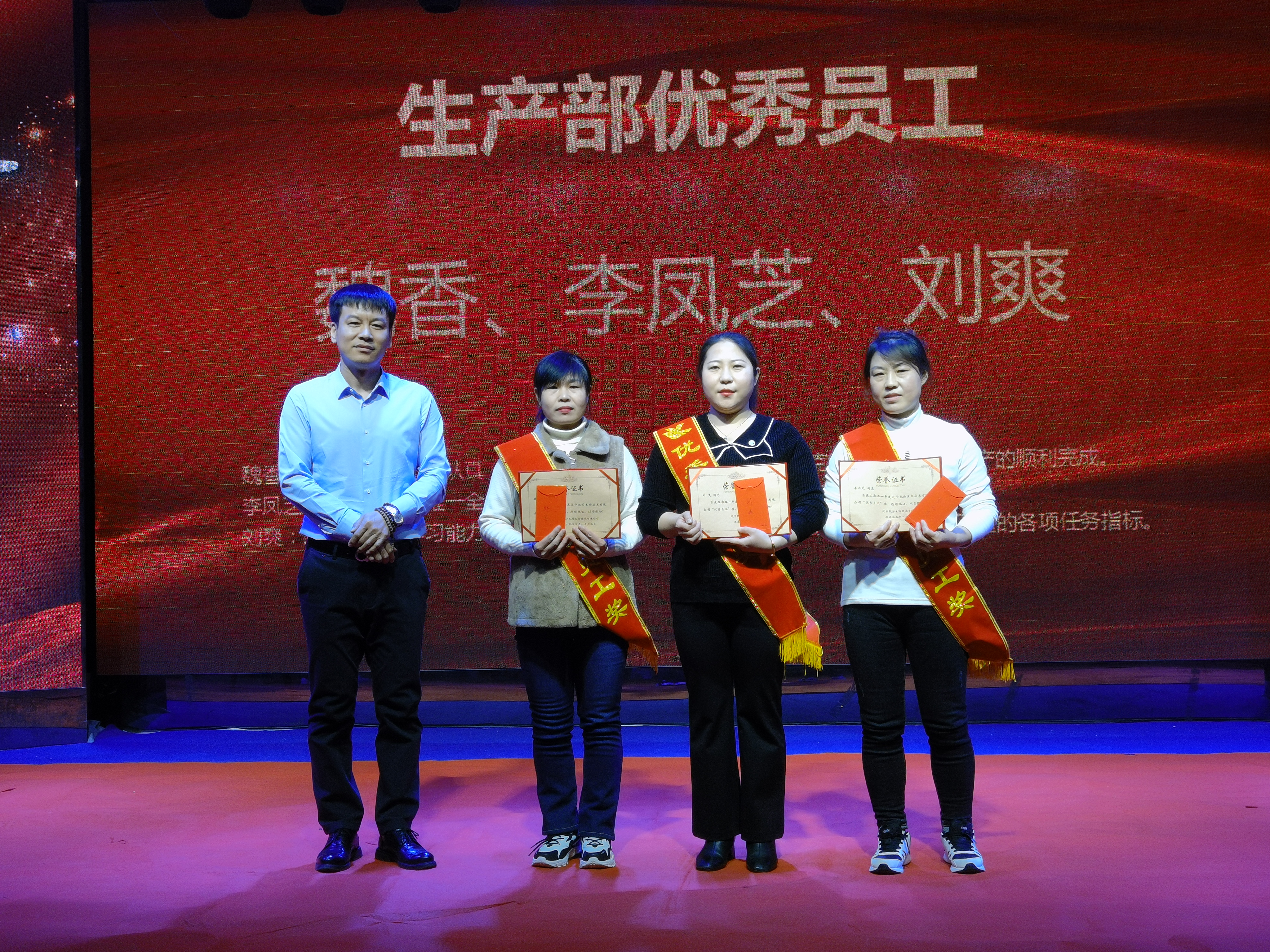 魏香、李鳳芝、劉爽獲得生產(chǎn)部?jī)?yōu)秀員工獎(jiǎng),他們生活在生產(chǎn)一線,在生產(chǎn)車間改造情況下,能夠吃苦耐勞,克服困難,積積主動(dòng),盡職盡責(zé)的工作作風(fēng)滲透到車間的每一個(gè)日子,每一個(gè)角落,他們勤勤懇懇,他們熱情洋溢,他們默默無聞地創(chuàng)造著自己的價(jià)值。公司網(wǎng)絡(luò)事業(yè)部總經(jīng)理趙福寬為獲獎(jiǎng)?wù)?/span>頒獎(jiǎng)。