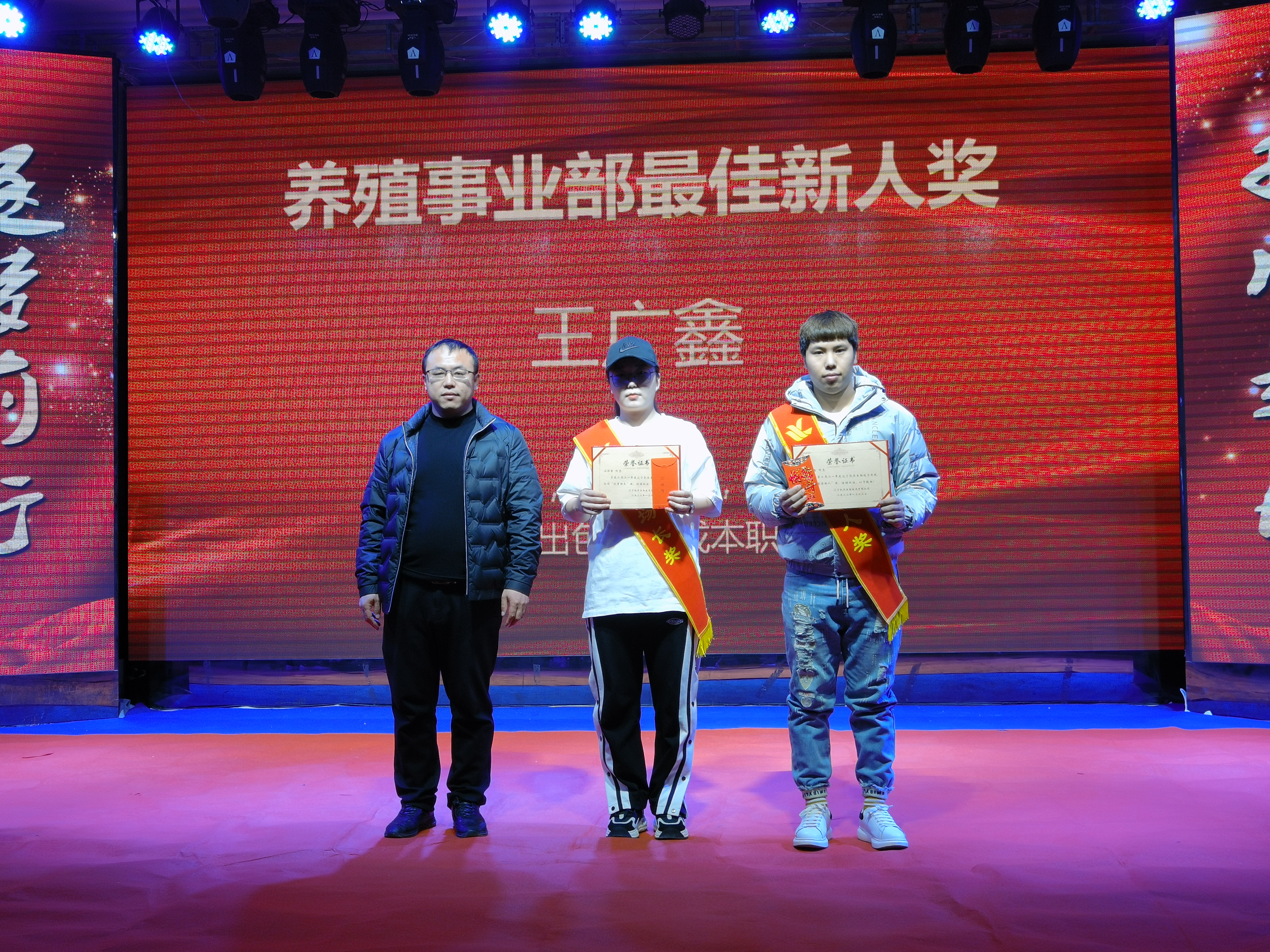 叢林智、王廣鑫獲得2021年度優(yōu)秀場(chǎng)長、最佳新人獎(jiǎng)。叢林智工作積極努力,技術(shù)精湛。能吃苦,肯鉆研,使凱豐養(yǎng)殖小區(qū)的出欄成績(jī)大幅度提升。并且創(chuàng)造凱豐養(yǎng)殖小區(qū)歷史最高歐值410以上,利潤單只最高。王廣鑫踏實(shí)肯干,勤奮好學(xué)。協(xié)助場(chǎng)長出色的完成本職工作。得到領(lǐng)導(dǎo)和同事的一致的高度好評(píng)。公司養(yǎng)殖場(chǎng)總經(jīng)理劉迪為獲獎(jiǎng)?wù)?/span>頒獎(jiǎng)。